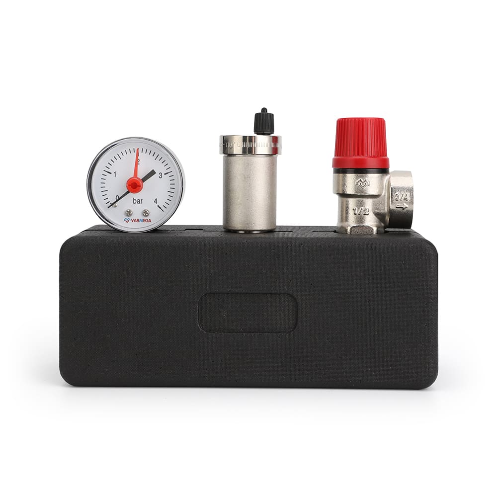 Группа безопасности котла Varmega применяется в закрытых системах водяного отопления для защиты от превышения максимально допустимого рабочего давления и отвода воздуха.