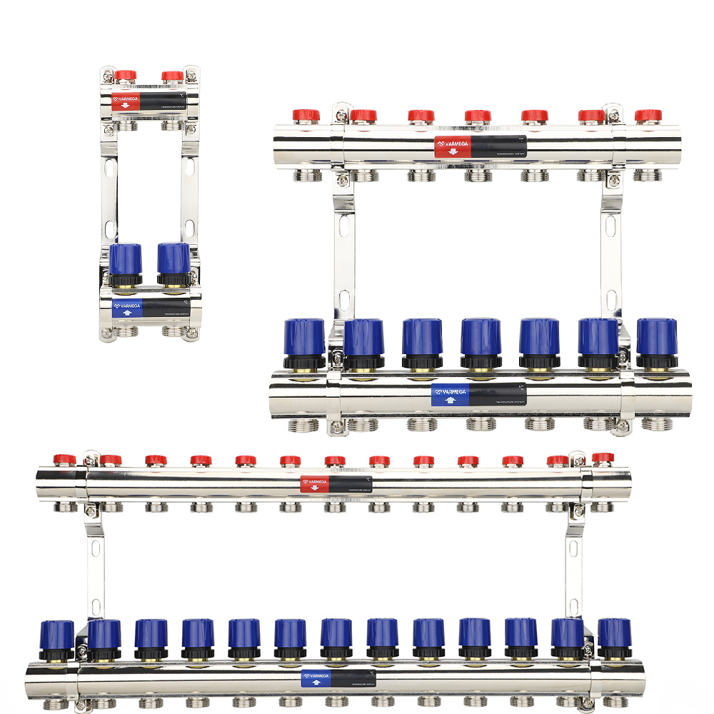 Коллекторные группы из латуни под брендом Varmega предназначены для распределения и регулирования потоков теплоносителя в низкотемпературных (серия VM154XX) и/или высокотемпературных (VM158XX) системах отопления. В качестве «потребителя» выступает прибор отопления, контур или петля «теплого пола», а также, отдельные части или ветви системы.